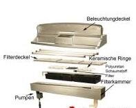 Osvětlení:3 ks samostatně zapínatelné trubice 2x30 W, 10000K bílá 895mm, 1x25W 15000K fialová 743mm.