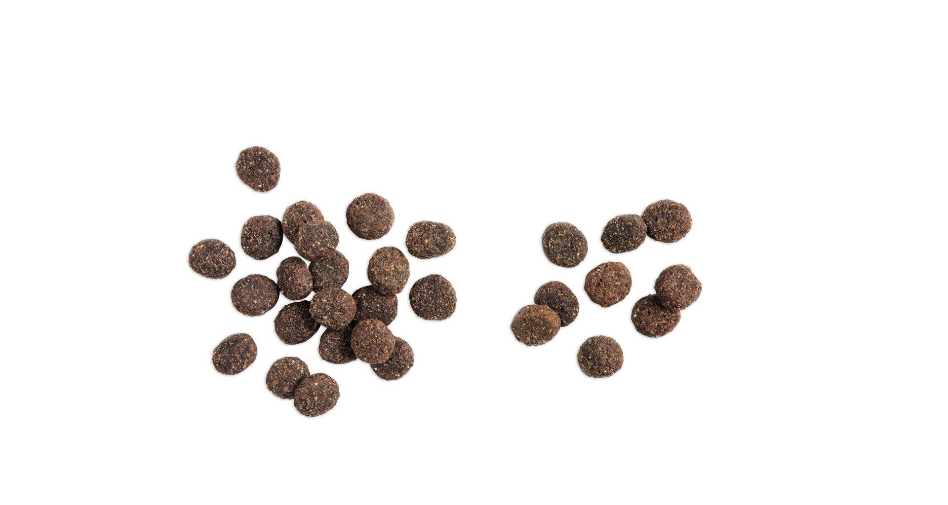 Drůbeží bílkoviny - sušené (16 %); kukuřice; krmná ovesná mouka; hrachová mouka; rybí moučka z mořských ryb (8 %); kukuřičné šroty; drůbeží tuk; sušená řepná dužina - odcukřená; fazolová mouka (Vicia faba); pivovarské kvasnice - inaktivované, sušené (2,5 %); rohovník obecný - sušený; lososový olej (1. 5 %); drůbeží játra - hydrolyzovaná; fosforečnan vápenatý; lněné semínko (1,1 %); chlorid sodný; chlorid draselný; bylinky - sušené (listy kopřivy, kořen hořce, centaur, heřmánek, fenykl, kmín, jmelí, řebříček, listy ostružiníku) (0,2 %); yucca schidigera (0,025 %)