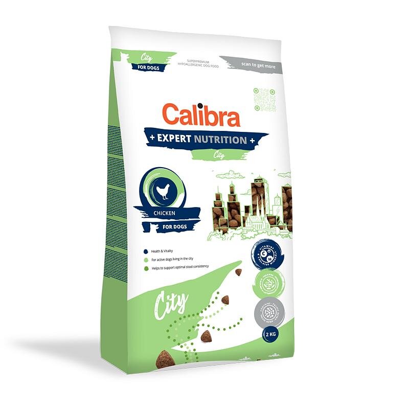 Calibra Dog Expert Nutrition City jsou hypoalergenní granule pro dospělé městské psy, kteří žijí aktivním stylem života. Toto kompletní krmivo obsahuje zvýšené množství vitaminů a minerálů, které podporují celkové zdraví a vitalitu psa. Složení obohacené o antioxidanty, které mimo jiné snižují výskyt volných radikálů, je přizpůsobeno životnímu stylu psa chovaného v?prašném městském prostředí a jeho potřebám při aktivním životě. Složení receptury pomáhá navíc podporovat zdravé zažívání a optimální konzistenci stolice.