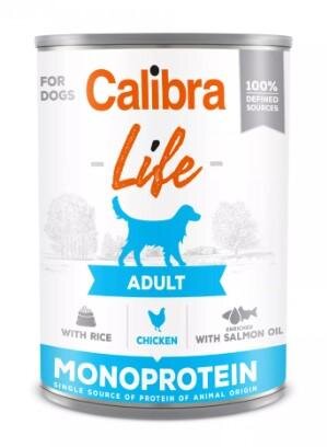 Calibra Dog Life Adult Chicken with Rice – receptura konzervy s kuřetem, kuřecími srdíčky a rýží je kompletním krmivem, která je určená pro dospělé psy.