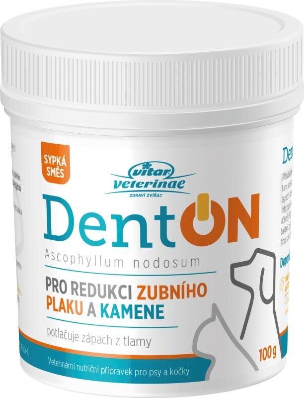 DentON (De-Plague) plv. 100 gPopis:Veterinární nutriční doplněk pro redukci zubního plaku a kamene u psů a koček.Přírodní přípravek obsahuje mořskou řasu Ascoph...