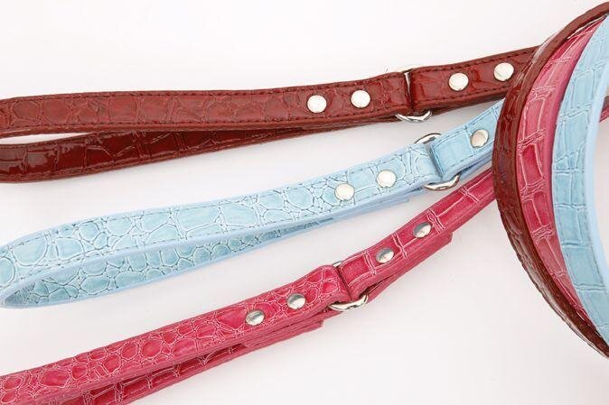 Inspirovaný moderní vzhled Croco Faux obojek Croc ze syntetické kůže. K dispozici v růžové, červené a modré a ve velikostech 32cm, 38cm, 45cm, 55cm, 65cm a 28 cm pro kočky. Vodítko o délce 120 cm doplňuje vzhled.