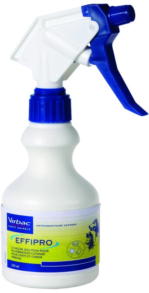 Stříkejte Effipro sprej na tělo zvířete ze vzdálenosti cca 10-20 cm. Stříkejte proti směru růstu srsti a zajistěte, aby byla veškerá srst zvlhčená. Načechrejte srst zejména u dlouhosrstých zvířat, aby mohl přípravek proniknout až na kůži. K ošetření hlavy a k ošetření mladých a neklidných zvířat nastříkejte přípravek na rukavici a jemně vetřete do srsti. echejte přirozeně zaschnout. Nevysušujte vytíráním ručníkem.