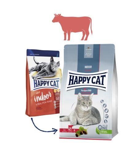Krmivo Happy Cat Indoor Voralpen-Rind bylo vyvinuto speciálně pro bytové kočky. Přírodní vláknina podporuje snižovaní tvorby chlupových smotků a juka pomáhá snižovat zápach trusu.