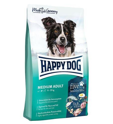 Happy Dog MEDIUM ADULT obsahuje 5 zdrojů vysoce stravitelných živočišných proteinů té nejlepší kvality a tomu přiměřených 12% tuku s životně nezbytnými omega-3 a omega-6 mastnými kyselinami z kvalitních živočišných a rostlinných zdrojů. Tato speciální receptura s přizpůsobeným tvarem granulí a s jedinečným Happy Dog Natural Life Concept® z přírodních přísad je doplněna ještě pravými novozélandskými mušlemi a perfektně se hodí pro všechny dospělé psy od 11 do 25 kg. Obsah energie v MEDIUM ADULT je přizpůsoben 2 - 3 hodinám přirozeného pohybu denně a při doporučeném dávkování krmiva zamezuje překrmování živinami a z toho plynoucím problémům.