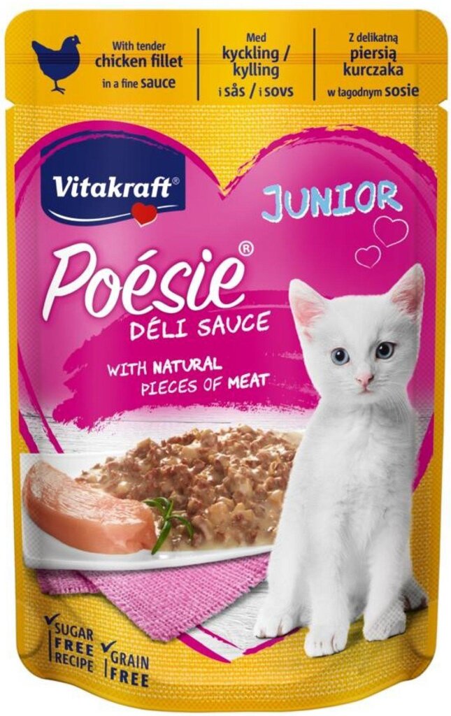 Každý sáček Poésie® Déli Sauce Junior obsahuje kvalitní přírodní kousky masa v lahodné omáčce pro dokonalý požitek. Nejlepší ingredience zaručují nejvyšší kvalitu a perfektně odpovídají výživovým potřebám mladých koček. Ani váš miláček nebude mít této delikatesy nikdy dost. Vitakraft. Z lásky.