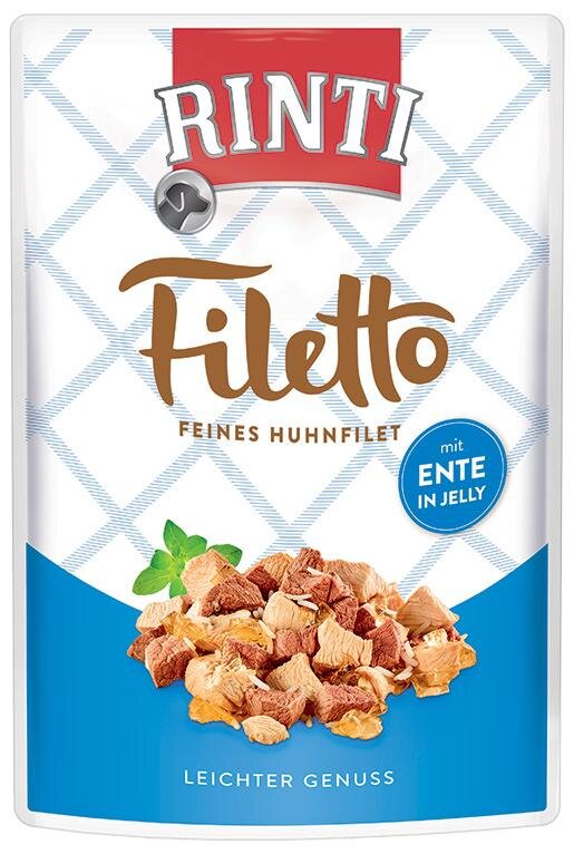 Složení kapsičky Rinti Filleto kuře & Kachna 48% kuřecí maso; 10% kachní maso; 1,5% rýže; minerální látky
