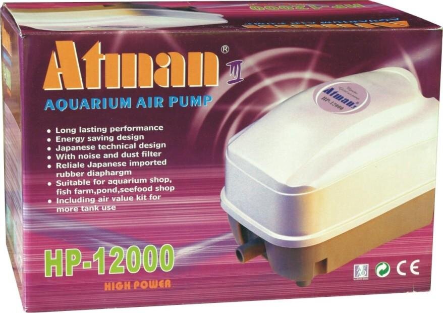 Vzduchovací motor pro provzdušňování několika akvárií. Je vhodný do pěstíren ryb. Příkon motoru Atman HP-12000 je 60W a maximální výkon 6600l/hod.