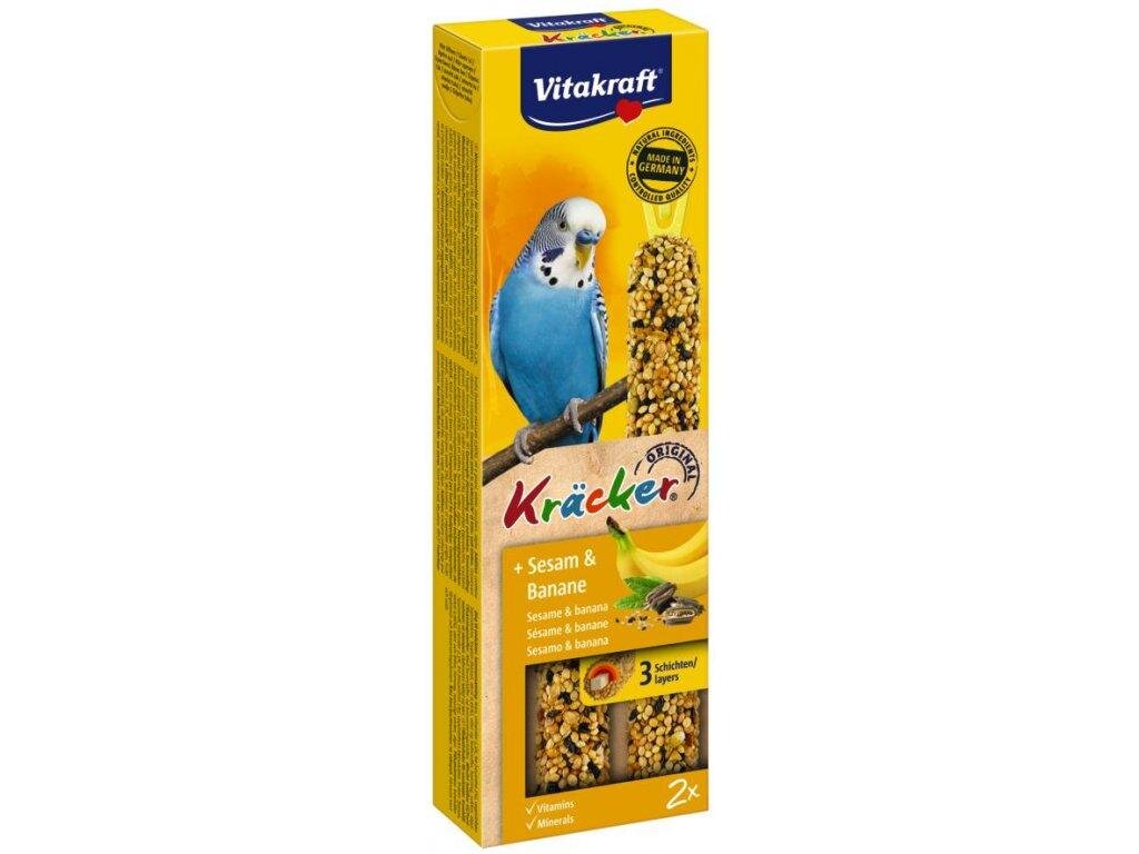 Třikrát zapékané tyčinky pro andulkyse sezamem a banánem s důležitými vitamíny receptura bez cukru na neošetřeném dřívku s praktickým držákem pro upevnění v kle...
