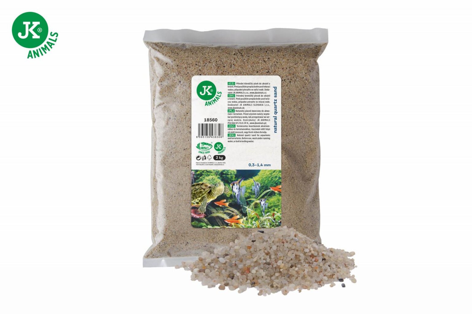 přírodní křemičitý písek vhodný do akvária nebo terária hrubost (frakce) 0,3–1,4 mm hmotnost 2 kg Přírodní křemičitý písek do akvárií a terárií. Balení 2 kg. Fr...