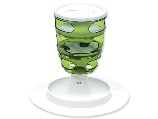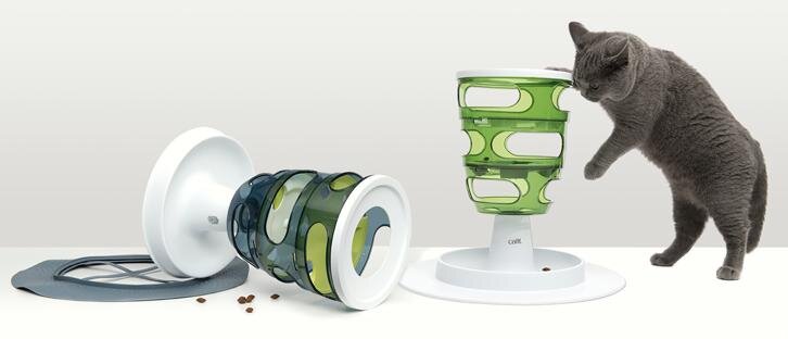 Krmivo nasypané v zásobníku vaše kočka získá hmatáním packami na labyrint, čímž při hře granule vypadávají do spodního zásobníku.