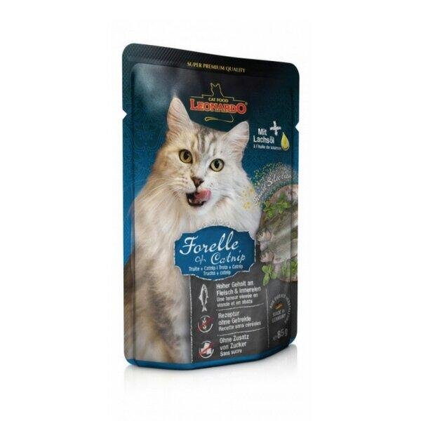 Kapsička pro kočky Leonardo se pstruhem a šantou kočičí podpoří zdraví a dobrou náladu na každý den.