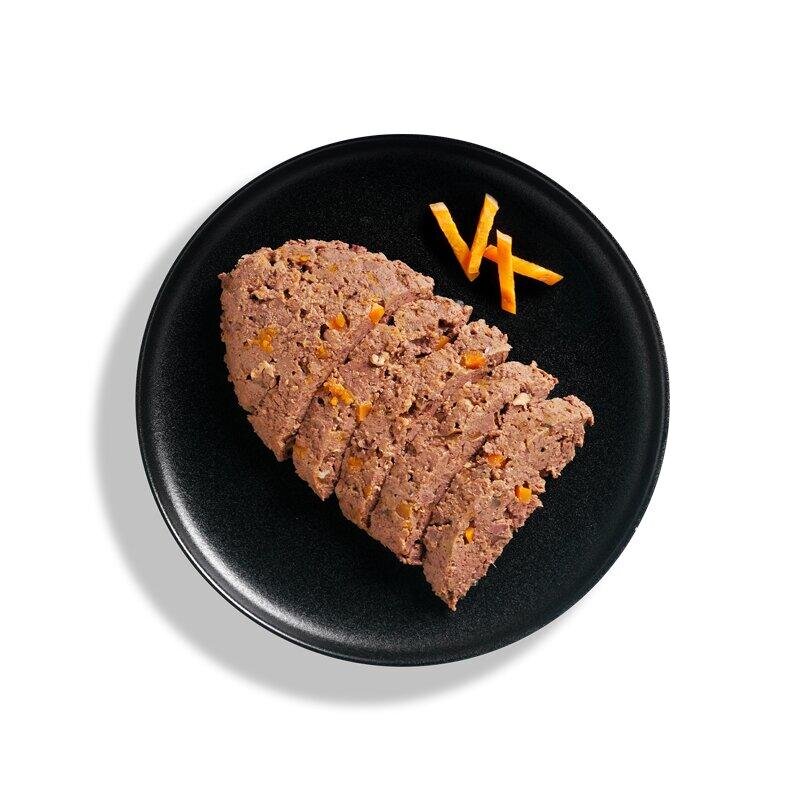Telecí plíce, ledviny (36,5 %), drůbeží maso, srdce, játra (30 %), masový vývar (28,3 %), mrkev (4 %), prášek z vaječných skořápek (0,5 %), minerální látky (0,5 %), lososový olej (0,2 %)