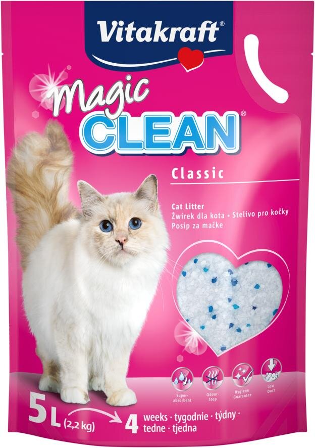 5 litrů steliva Magic Clean značky Vitakraft vydrží stejně dlouho jako 20 litrů běžného hrudkujícího steliva. Vyznačuje se vysokou savostí a je tudíž velmi trvanlivé. Vydrží až 4 týdny. Pokud máte koček více, je potřeba stelivo měnit častěji.