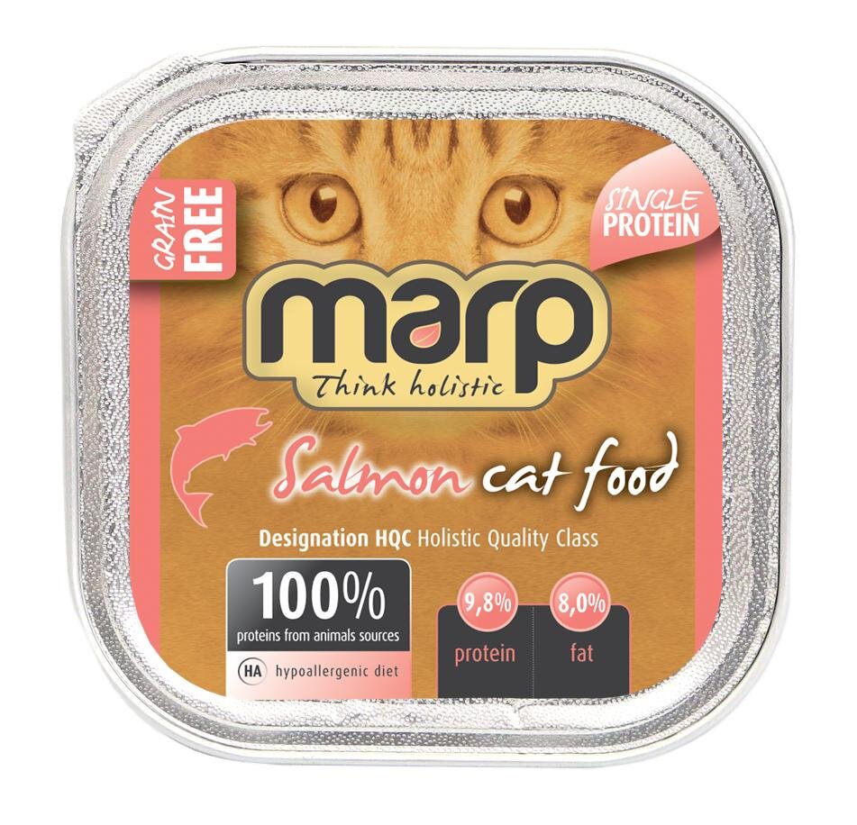 Víme, že kočka je masožravec a proto ji jako takovou ctíme. Konzervy Marp Pure obsahují 100% bílkovin ze živočišných zdrojů. Obsahují pouze maso, vnitřnosti, vývar a minerály. Nepoužíváme žádné umělé konzervanty, barviva, plnidla apod. a jsou vždy bez jakýchkoliv obilovin. Konzerva Marp s lososem bez obilovin je vhodná i pro kočky s citlivým zažíváním a dle našich zkušeností je velmi vhodná i pro kočky s potravními alergiemi.