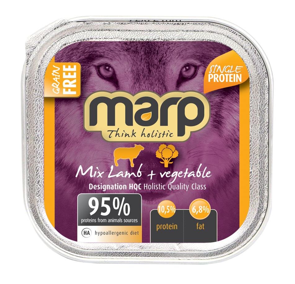 Víme, že pes je masožravec a proto ho jako takového ctíme. Konzervy Marp Mix obsahují 95% bílkovin ze živočišných zdrojů. Obsahují pouze maso, vnitřnosti, zeleninu, vývar a minerály. Nepoužíváme žádné umělé konzervanty, barviva, plnidla apod a jsou vždy bez jakýchkoliv obilovin. Konzerva Marp Mix s jehněčím bez obilovin je vhodná pro psy s citlivým zažíváním a dle našich zkušeností je velmi vhodná i pro psy s potravními alergiemi.