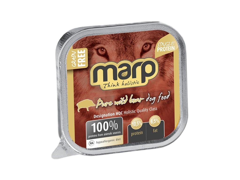 Víme, že pes je masožravec a proto ho jako takového ctíme. Konzervy Marp Pure obsahují 100% bílkovin ze živočišných zdrojů. Obsahují pouze maso, vnitřnosti, vývar a minerály. Nepoužíváme žádné umělé konzervanty, barviva, plnidla apod a jsou vždy bez jakýchkoliv obilovin. Konzerva Marp s divočákem bez obilovin je vhodná pro psy s citlivým zažíváním a dle našich zkušeností je velmi vhodná i pro psy s potravními alergiemi.