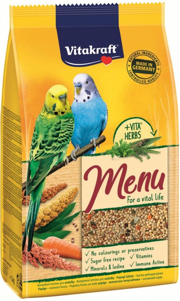 Menu Vital je kompletní krmivo s vysoce kvalitními semeny, na slunci dozrálými zrny, eukalyptovými listy a kousky mrkve pro zdravou všestrannou péči o andulky. Vyvážená směs odpovídající specifickým potřebám těchto ptáků, která jim nejen chutná, ale dodává jim i všechno, co potřebují pro zdravý život. Životně důležité vitamíny zabraňují projevům jejich nedostatku. Beta-glukany posilují obranyschopnost organismu. Minerály, jód a další stopové prvky podporují metabolismus. VITA HERBS pečlivě sestavená směs cenných bylinek jako petržel, jitrocel a tymián, které podporují dobrý zdravotní stav ptáků.