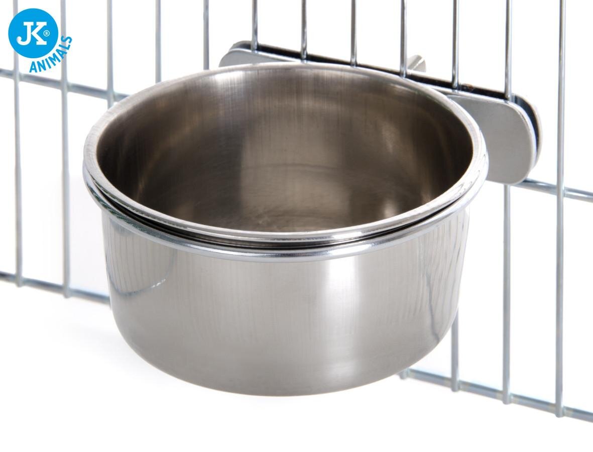 Miska z nerezu pro ptáky, kterou lze zavěsit na dráty klece pomocí kroužku. Ten se nejprve přišroubuje