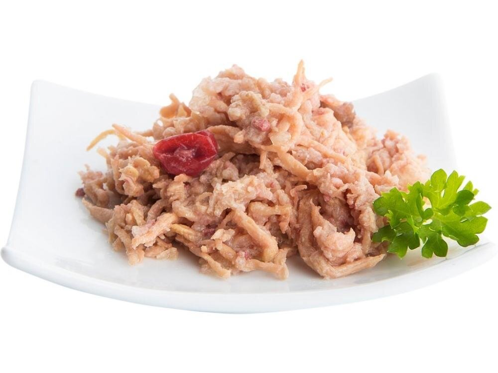 Složení: 60 % kuřecí maso, kuřecí játra, kuřecí tuk, 36,8 % vývar, 2 % brusinky, 1 % minerály, 0,2 % lněný olej = 100% prvotřídních ingrediencí. Analytické složky: hrubý protein 12 %, hrubý tuk 5,5 %, hrubý popel 2,3 %, hrubá vláknina 0,5 %, vlhkost 76 %.
