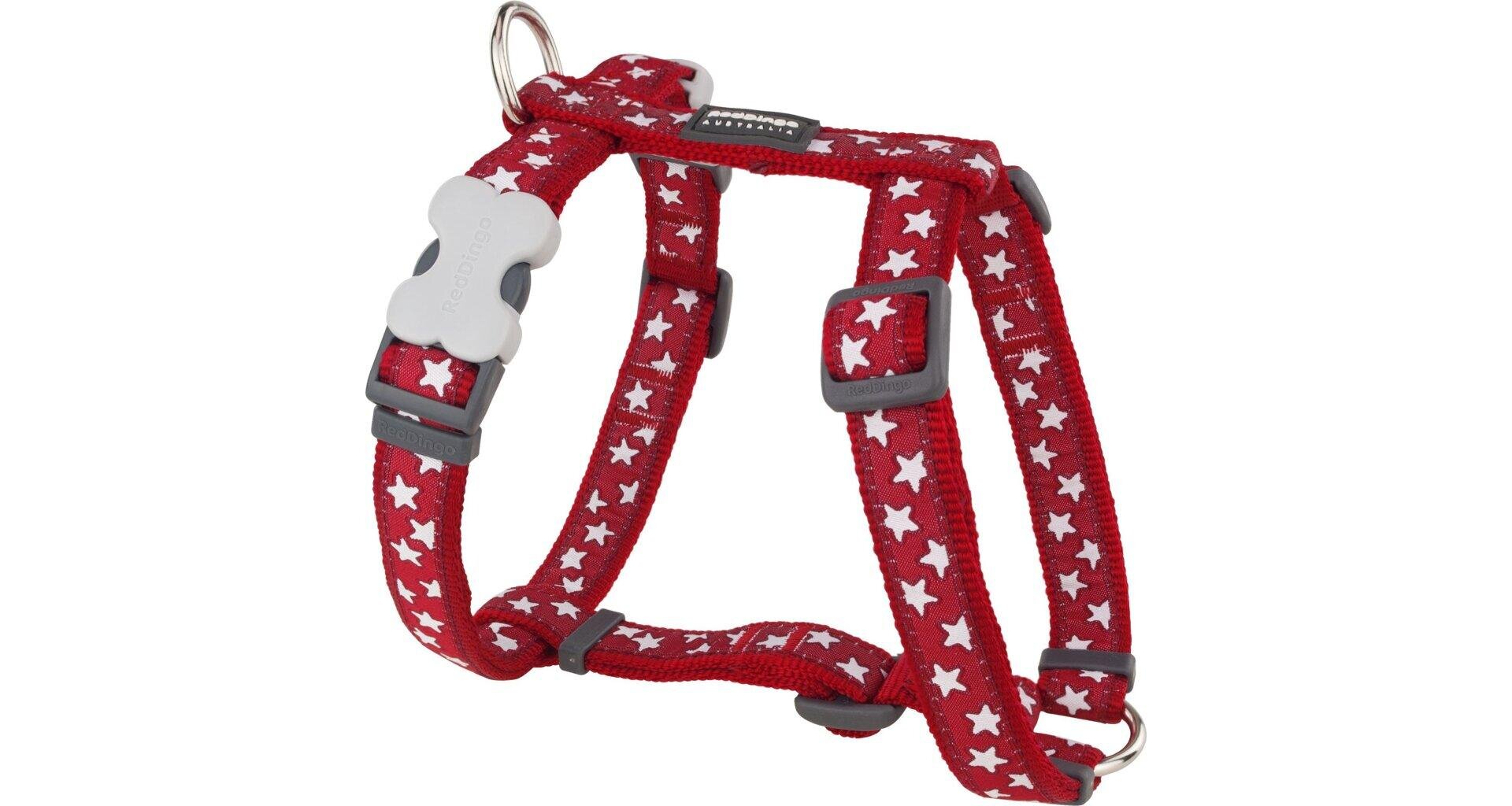 Postroj Red Dingo pro psy s obvodem hrudníku 45 - 66 cm. Šířka popruhu 20 mm. Vzor Stars White on Red.