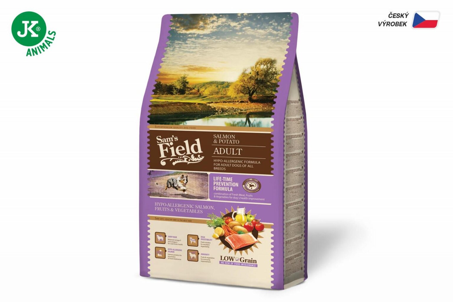 Sam's Field Low Grain Adult Salmon & Potato. Superprémiové hypoalergenní bezpšeničné krmivo s vysokým obsahem lososa 31 %.