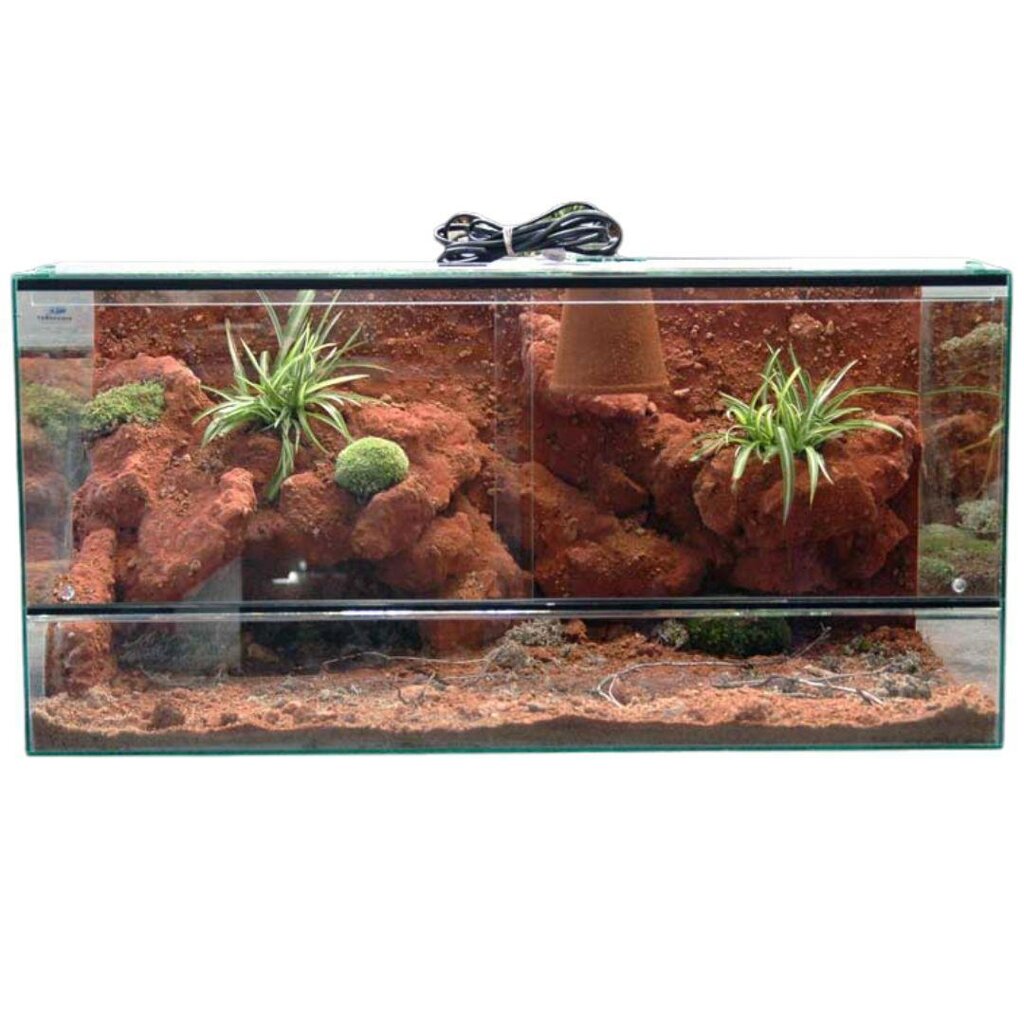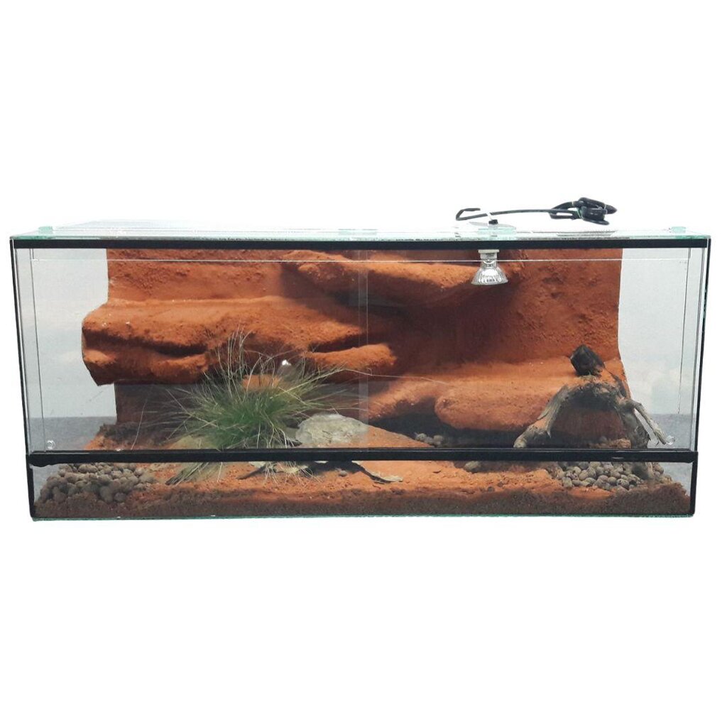 Plně vybavené skleněné terárium pro terarijní zvířata (agamy, hady, želvy) o rozměrech: délka 80cm, šířka 40cm a výška 35cm. Terárium má horní větrání a otevírání vpředu pomocí skleněných pojízdných dvířek. Terárium je vybaveno pozadím v různých barvách, substrátem, úkryty a další dekorací. Je vybaveno 1x světelným kabelem na 220V s objímkou E27 a vnitřním stínítkem pro ochranu zvířat před popálením.