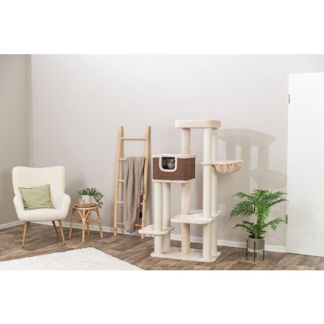 velkorysé škrabadlo se 2 platformami, hamakou, lůžkem a jeskyní lůžko s okrajem polstrované plyšem silné stabilní sloupky motané odolným sisalem jeskyně uvnitř...