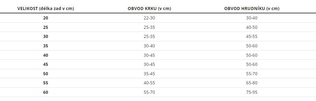 Velikost vesty volte na základě rozměrů uvedených v tabulce.